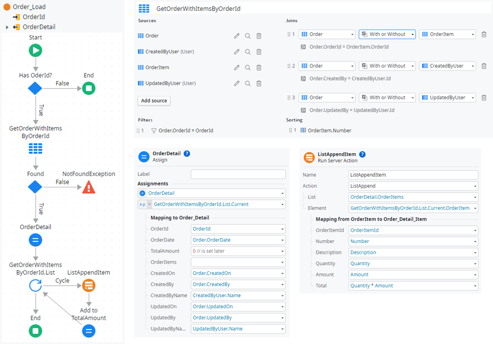 • The action begins by checking if OrderId <> NullTextIdentifier(). This ensures that in absence of the OrderId required to proceed with the data retrieval, an empty (initial) Order_Detail structure is returned. If desired, default values for the attributes of new orders could also be set here.