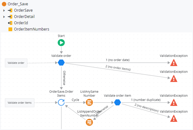 Validation is carried out by examining if ListAnySameNumber.Result is true, which utilizes the expression Value = OrderSave.OrderItems.Current.Number to identify a match in the local variable OrderItemNumbers of type Integer List. This variable is employed to keep track of numbers already in use. Successful validation appends all numbers from validated order items to this list using ListAppendOrderItemNumber.