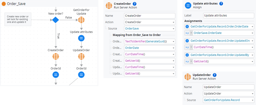 Within the second block of the Order_Save server action, the system determines whether to create a new purchase order or update an existing one, based on the condition OrderDetail.OrderId = NullTextIdentifier().