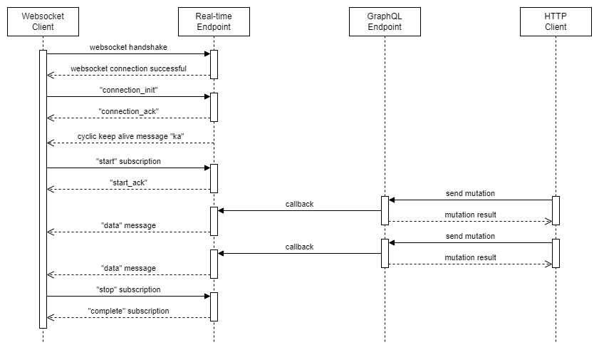 Now that we have the websocket server up and running, we want to consume it in an OutSystems application. As I wrote above, OutSystems is not supporting websocket natively. But one of the advantages I really like a lot about OutSystems is that you can extend the framework with custom code. Here we need some functionality for the client-side, so the language to go is JavaScript. If you read through the AppSync documentation, you find everything that needs to be implemented for doing real-time communication via websocket connection. This includes a handshake to initialize the connection, how to start and stop subscriptions and how to send and receive messages. The following diagram shows the whole communication process: