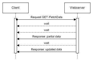 The issue with polling is that the connection between client and server is closed after each response. Wouldn’t it make sense if the connection could remain open to allow the server to send a response whenever new data is available? This method is known as long-lasting requests. Although there are timeouts for the HTTP connection within which the request must be completed, the transmission of a response with large amounts of data can certainly take longer. In addition, there is a wait status defined in the protocol, which the server can use to inform the client to wait a little longer for the result. So the client could make such a long-running request and the server needs to keep the connection open and periodically either send a wait status or “stream” the next data update. If the connection is interrupted, the client can simply initiate the next request. The disadvantage of this approach is that, by default, each browser can only send a limited number of simultaneous requests to the same server and a web server can only process a limited number of requests at a time. In order to not negatively affect the performance for other requests, separate web servers must be provided for such a solution. In addition, bidirectional communication is not possible within an open connection.