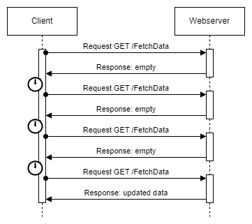The simplest and probably most obvious solution is for the client to regularly check with the server whether new data is available. This process is called polling and can be implemented with a small JavaScript which calls the data fetch action periodically. The disadvantage of this approach is that the client requests data even when there is no new data available. This leads to an unnecessarily high load on the server and can only be counteracted by a longer polling interval. But this also means the time between availability of a data update and its arrival at the client lasts longer. Therefore, this solution is not suitable for scenarios that require real-time communication.