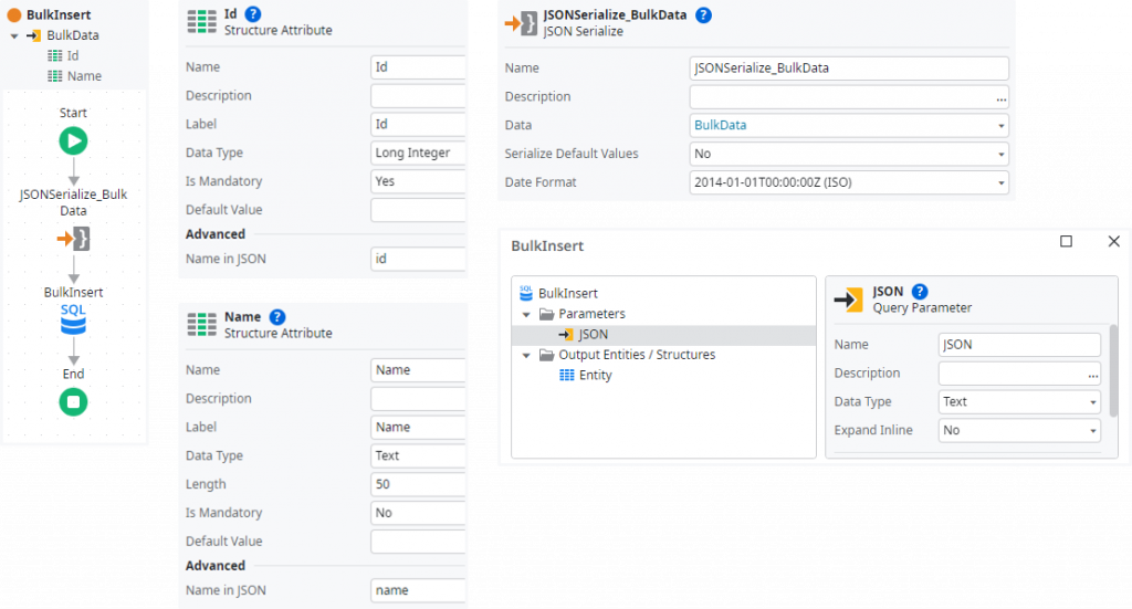 First, we create a structure in OutSystems that defines the format of the data to be transferred. Even if it is possible to only refer certain attributes or sub-objects in SQL, for performance reasons it is advisable to optimize the structure to a minimal number of attributes. In this way, not only the network traffic to the database can be reduced, but also the size of the database transaction log. As these identifiers must be hard-coded in the SQL statement, I also recommend explicitly setting the “Name in JSON” property to avoid errors when structure attributes are renamed at a later date.