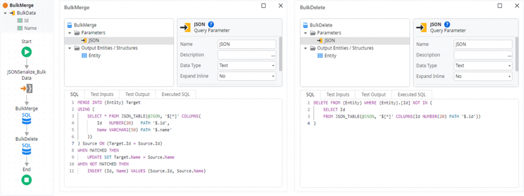 Please notice, that there is no tailing semicolon, as this is handled by OutSystems automatically for Oracle. For the deletes we need to implement a second statement. Unfortunately, the Advanced SQL node for Oracle does not allow separating several statements by a semicolon. Thus we are forced to do the deletion in a separate SQL node and end up with two database roundtrips: